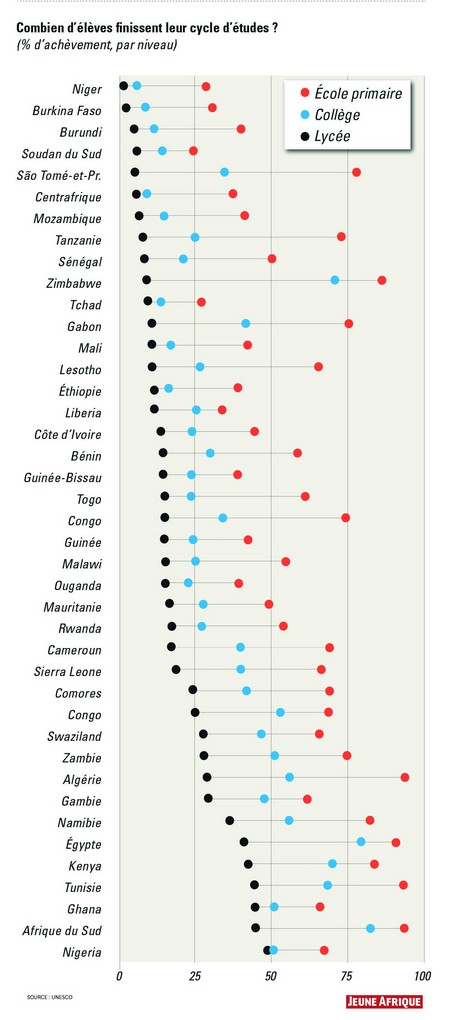 Également, sur les treize pays d’Afrique dont les budgets alloués à l’éducation ont été étudiés, seuls trois (Mali, Burkina et Côte d’Ivoire) l’ont augmenté entre 2010 et 2015. Enfin, la moitié des élèves – au mieux – commençant le lycée (premier cycle de secondaire) ne le terminent pas, comme le montre un autre schéma.